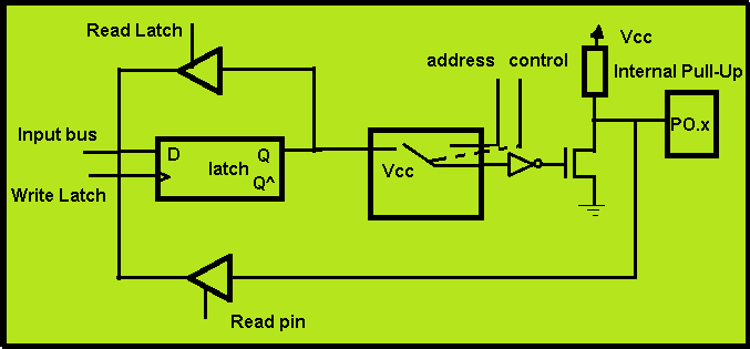 Let us assume that control is ‘0’. When the port is used as an input port, ‘1’ is written to the latch. In this situation both the output MOSFETs are ‘off’. Hence the output pin have floats hence whatever data written on pin is directly read by read pin.