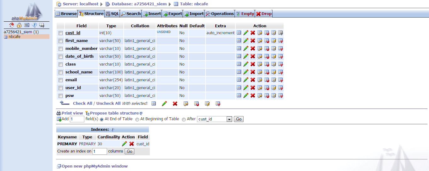 $query = “INSERT INTO nbcafe (first_name, mobile_number, date_of_birth, class, school_name, email, user_id, psw) VALUES (‘$firstname’, ‘$mobile’, ‘$dob’, ‘$class’, ‘$school’, ‘$email’, ‘$user_id’, ‘$psw’)”;