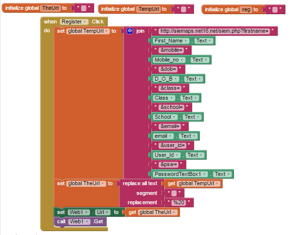 If you are working with MIT App Inventor. Then you know, it need programming with logic blocks. For beginner do not take tension you can see me post How to make your own android apps without programming? The main portion of this project is proper logical block connection for registration form. The main aim of this app is take the input data and send it to PHP by making exact url.