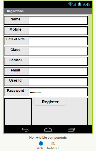 Lets start with design a registration form on MIT APP Inventor. For that I used eight label to write our eight filed name. Seven text field box to take text input. One password text box to take password. And one button to make register button. For working with programming logic, we have to take Non-Visible component like Web1 and Notifier1.